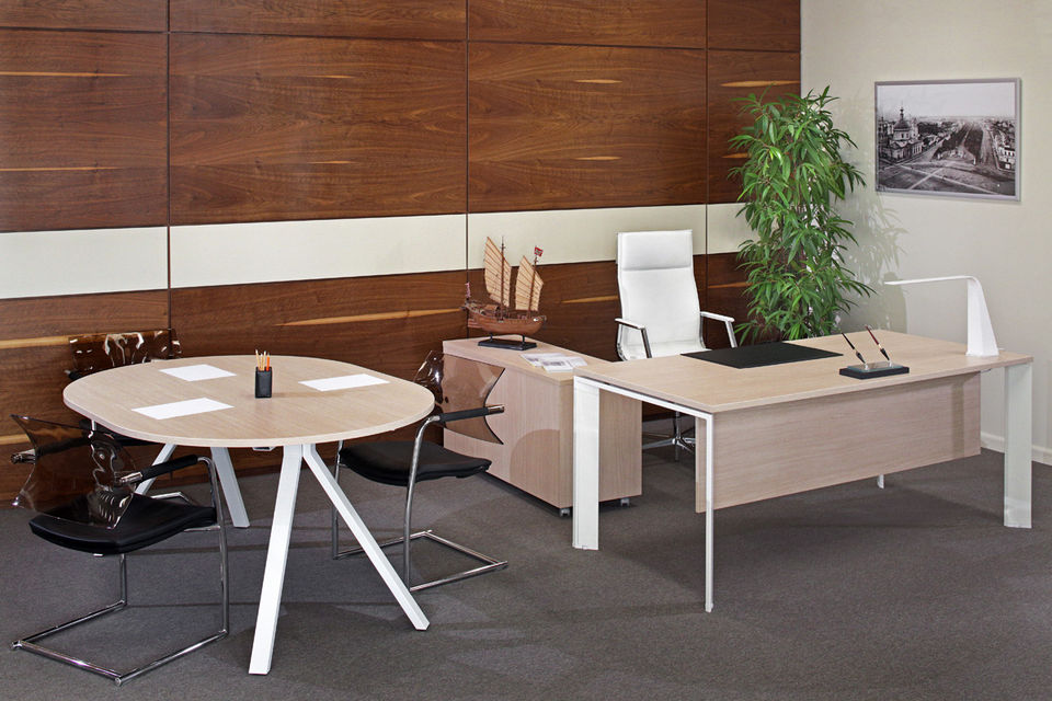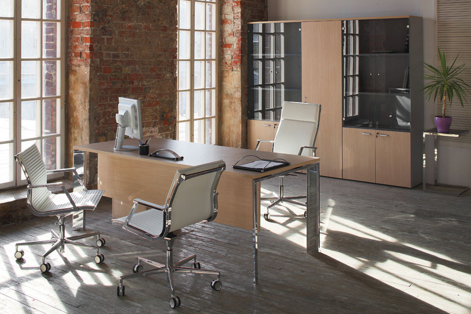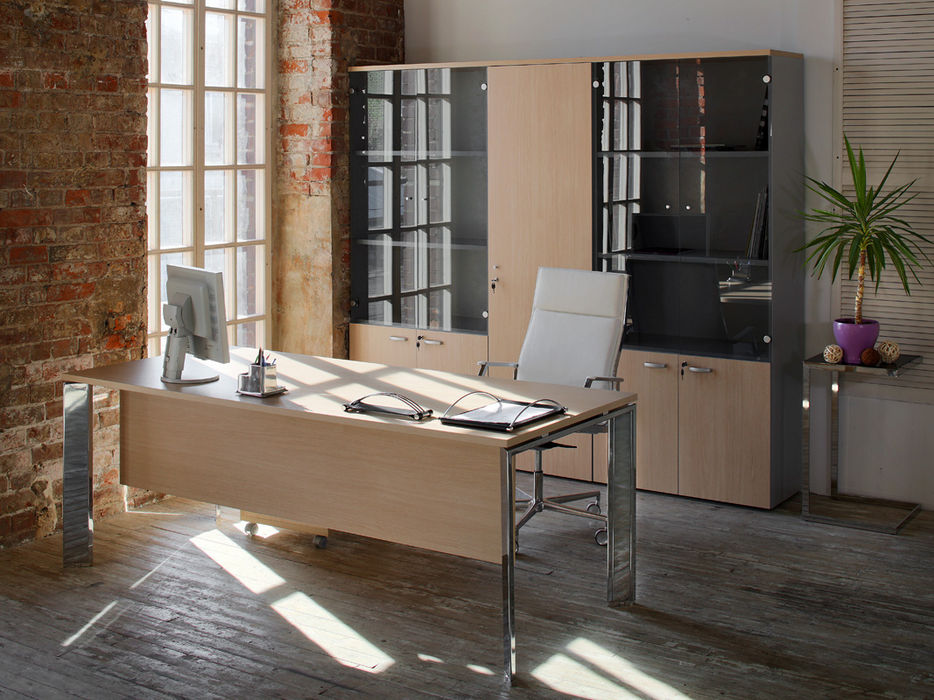 шкафы высотой 206 см, каркас шкафов - серый, топ и фасады деревянных дверей - светлый дуб.