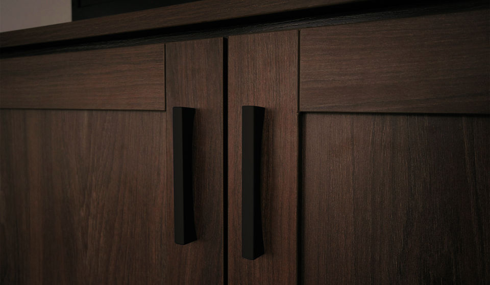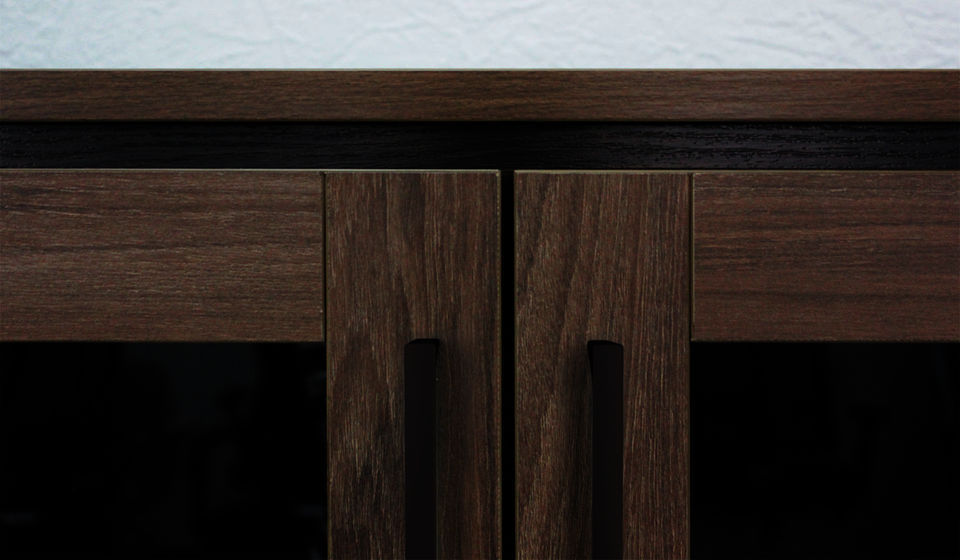 - Фасады шкафов обрамлены оригинальной ЛДСП-рамой с заполнением ЛДСП толщиной 10 мм или тонированным стеклом толщиной 4 мм.