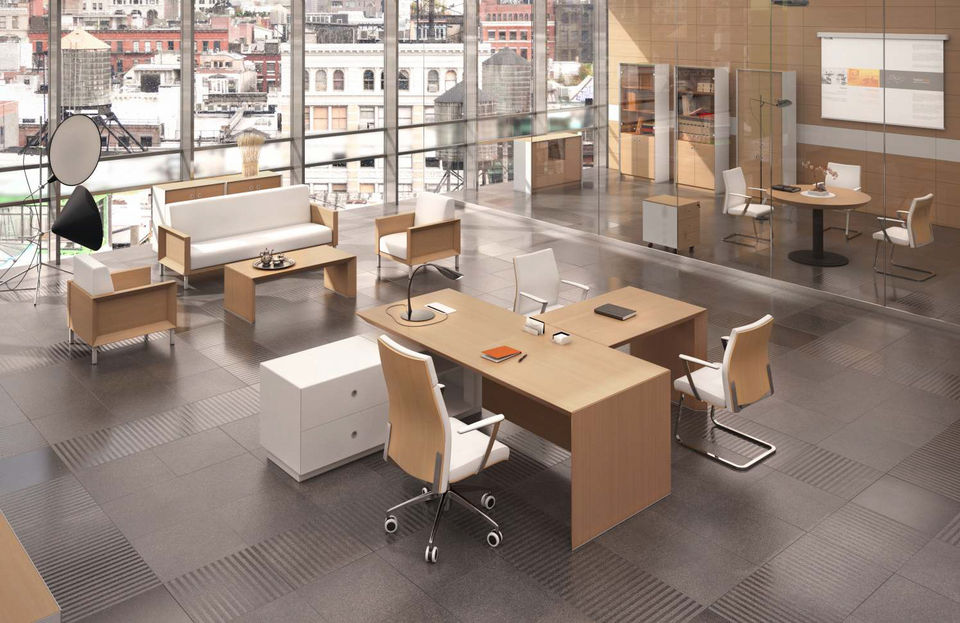 Небольшие круглые столы на черной металлической опоре предназначены для конфиденциальных переговоров с клиентами и оформления бумаг придают этому ансамблю особую изысканность. Выполненная в светлых тонах вторая линия коллекции TECO+ наполнит в Ваш офис легкостью и изяществом, сделав его местом, где работа, переговоры и отдых будут