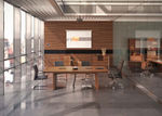 Ясные линии шкафов и комодов подчеркиваются алюминиевым профилем- кромкой по периметру их фасадов Свободную, удобную зону переговоров сформируют столы совещаний TECO+. Для общего обсуждения проектов на электронных носителях великолепно подойдут прямоугольные столы с кабель-каналом и модулем для подключения техники в столешнице.