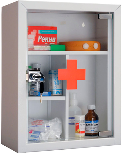 Корпуса у аптечки изготовлен из тонколистового металла, дверца из стекла
