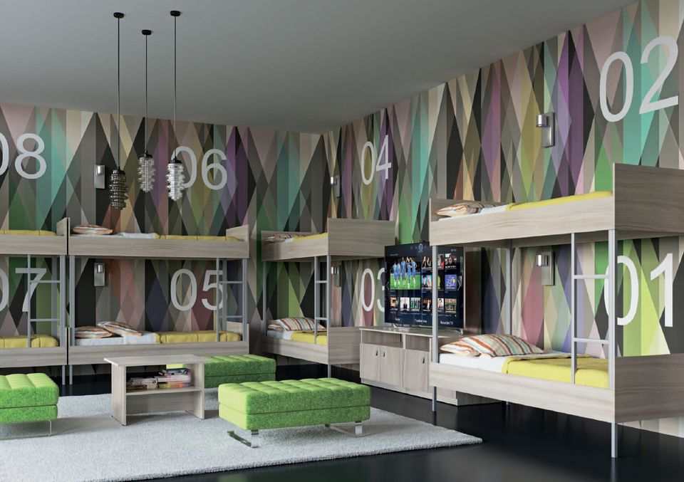 - Кровати разной вместимости (односпальные, двуспальные, тахты, двухярусные кровати) позволяют комплектовать разнообразные по площади помещения не только гостиничных номеров, но и пансионатов, хостелов и общежитий.