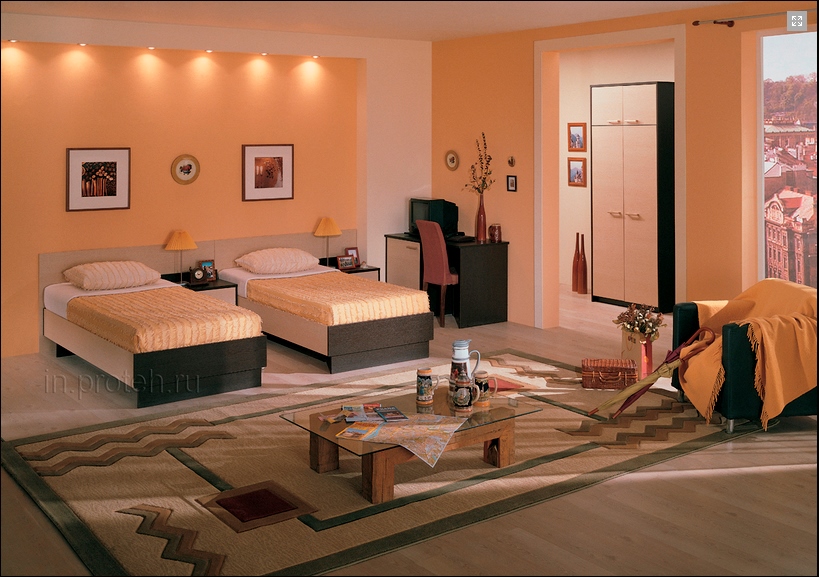 Мебель для гостиниц. Исполнение: комбинированный - дуб венге+дуб выбеленный, дуб венге. Материалы: ЛДСтП с меламиновым, антибликовым покрытием 22 мм и 16 мм.